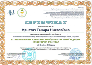 16-17 квітня 2021 року завідувачка кафедри фізичної реабілітації та медико-біологічних основ фізичного виховання, гарант освітньої програми Фізична реабілітація, доцент Евеліна Жигульова та доктор медичних наук. професор Тамара Христич взяли участь у Науково-практичній конференції з міжнародною участю «АКТУАЛЬНІ ПИТАННЯ КОМПЛЕМЕНТАРНОЇ/АЛЬТЕРНАТИВНОЇ МЕДИЦИНИ В ОЗДОРОВЧИХ ПРАКТИКАХ», організаторами якої були Таврійський національний університет ім. В.І. Вернадського.Національний еколого-натуралістичний центр учнівської молоді МОН України, ВГО «Асоціація фахівців з народної і нетрадиційної медицини України», Відділення фундаментальних проблем медицини Академії наук вищої школи України, Національна наукова медична бібліотека МОЗ України, ТОВ «Дніпровський медичний інститут традиційної і нетрадиційної медицини», ТОВ «Академія натуральної і комплементарної медицини».