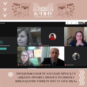 У ІІ семестрі 2020-2021 н. р. навчально-методичний центр забезпечення якості освіти університету продовжує реалізацію проєкту «Школа професійного розвитку викладачів Кам’янець-Подільського національного університету імені Івана Огієнка». В якому взяла участь асистент кафедри Горбата Роксолана Михайлівна.
