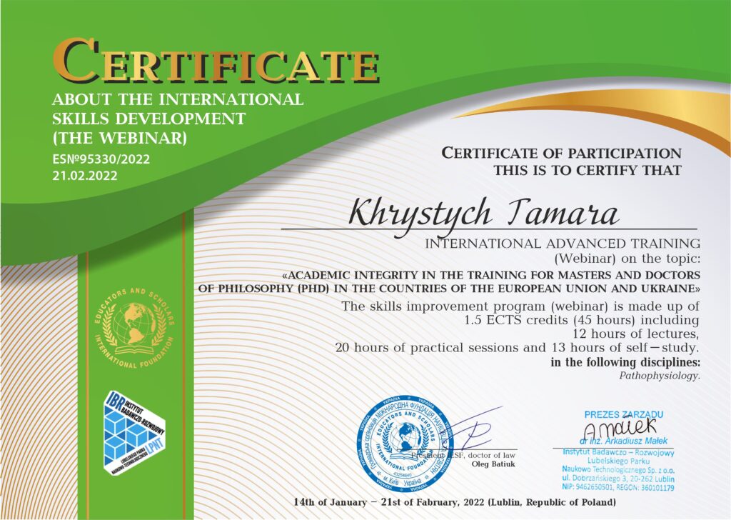 З 14.02. 2022 р. по 21.02.2022 р. доктор медичних наук, професор кафедри фізичної реабілітації та медико-біологічних основ фізичного виховання К-ПНУ ім. Івана Огієнка, членкиня Президії Українського Клубу Панкреатологів – Христич Тамара Миколаївна та кандидат педагогічних наук, доцент, фізичний терапевт Зданюк Вадим Володимирович прийняли участь в онлайн-вебінарі за Програмою міжнародного підвищення кваліфікації «Академічна доброчесність при підготовці магістрів та здобувачів доктора філософії (PhD) в країнах Європейського союзу та Україні» (обсягом 1,5 кредити ЄКТС).