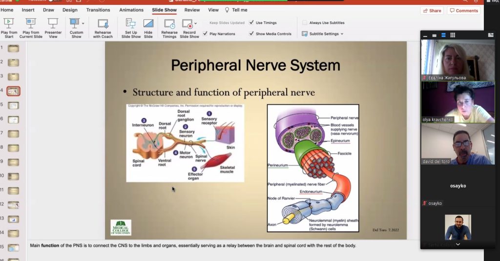 Трьохгодинна лекція професора Девіда Дель Торо розкрила сучасні погляди науковців на фізіологію та патофізіологію периферичних нервів, оцінку історій хвороб та результати огляду пацієнтів, електродіагностику уражень периферичних нервів.