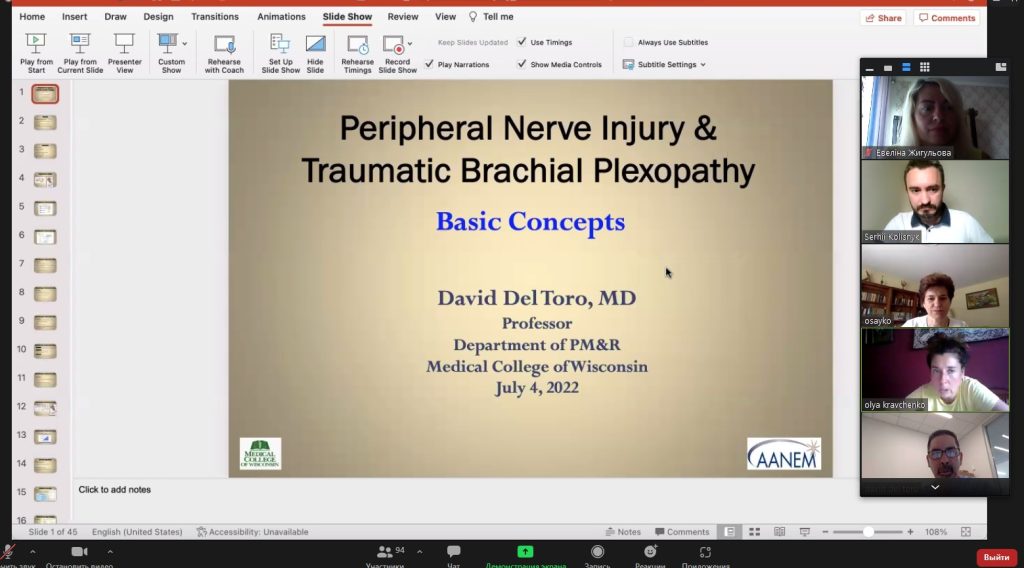 Трьохгодинна лекція професора Девіда Дель Торо розкрила сучасні погляди науковців на фізіологію та патофізіологію периферичних нервів, оцінку історій хвороб та результати огляду пацієнтів, електродіагностику уражень периферичних нервів.