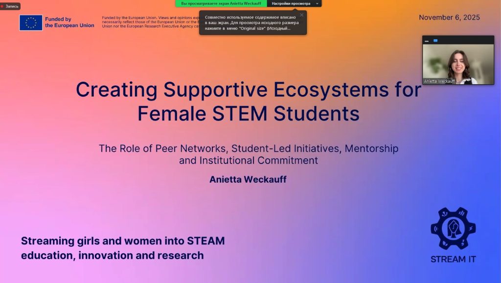 06 листопада 2025 р. завідувачка кафедри фізичної реабілітації та медико-біологічних основ фізичного виховання, кандидат біологічних наук, доцент Евеліна Жигульова взяла участь у вебінарі STREAM IT з питань політики «Driving Institutional Change in STEM: Best Practices for Inclusive Higher Education and Research.” («Сприяння інституційним змінам у STEM: найкращі практики для інклюзивної вищої освіти та досліджень»).